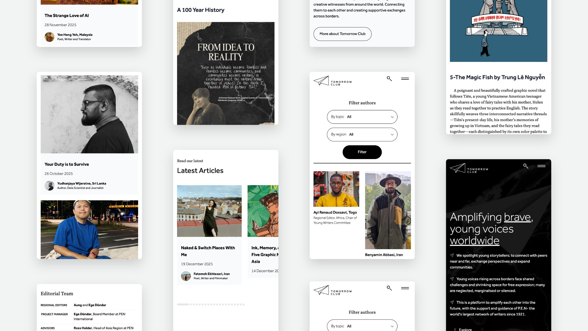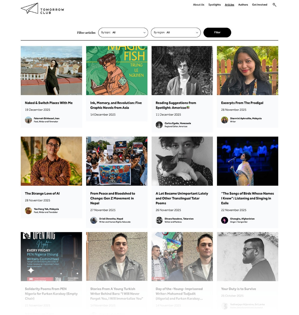 Tomorrow Club is a publishing and community platform backed by PEN International and PEN Norway, dedicated to amplifying young writers from around the world, including many whose voices are marginalised, suppressed or at risk. From identity through to digital, the work needed to carry the weight of that mission without becoming heavy. The design finds a balance between editorial clarity and genuine warmth, giving the platform the openness that invites contribution while framing the content with the seriousness it warrants.